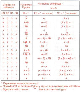 Programando adecuadamente las líneas de selección, S3S2S1S0 y la de modo M junto con la de acarreo previo, Cn, IaALU puede ejecutar 16 operaciones lógicas y 32 operaciones aritméticas diferentes con los datos A=A3A2A1A0 B=B3B2B1B0. Estas operaciones, con sus respectivos códigos de selección, se relaciona en la tabla de la figura Nº 6. Se asume que tanto las entradas como las salidas son activas en alto.